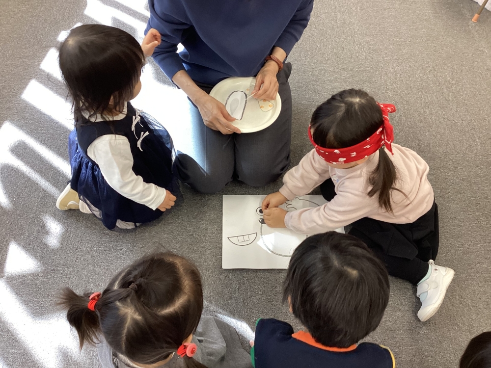 出来上がったお顔がとっても面白くて、みんなで大笑い!こうした「みんなで笑い合う経験」も、情緒を育む大切なステップです。